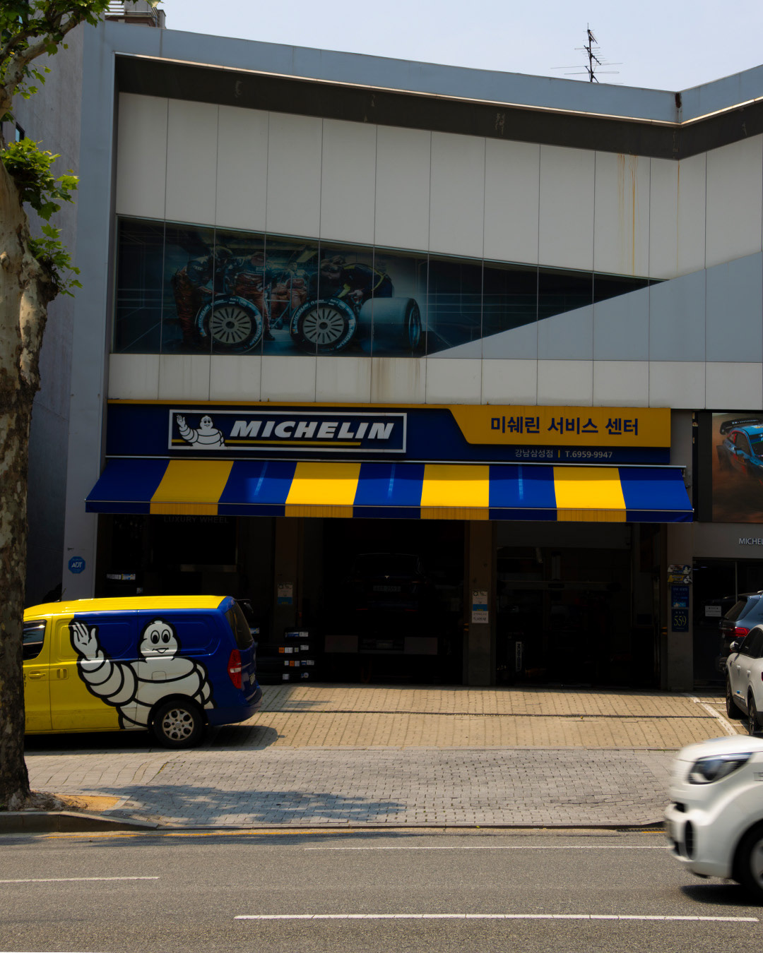 강남 일대는 고층 빌딩과 상가 건물이 가득한 곳이에요. 그래서 보통 통유리의 건물이나 튀지 않는 색상의 건물들이 많은 곳이죠. 그런데 그 일대를 걷다가 갑자기 눈에 확 들어온 곳이 있었어요. 노란색과 파란색의 어닝은 지나가던 사람들의 눈길을 사로잡기 딱 좋은 컬러였죠. 그곳은 바로 미쉐린 타이어나라 강남점이었습니다.